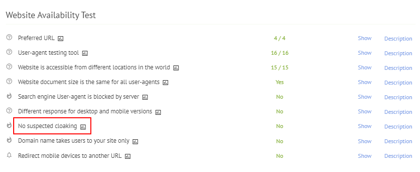 आप Labrika की वेबसाइट उपलब्धता जांच का उपयोग कर सकते हैं, जो तकनीकी साइट ऑडिट में मिलती है। यदि आपकी वेबसाइट में क्लोकिंग की समस्या हो तो इस ऑडिट में चेतावनी दिखाई देगी।