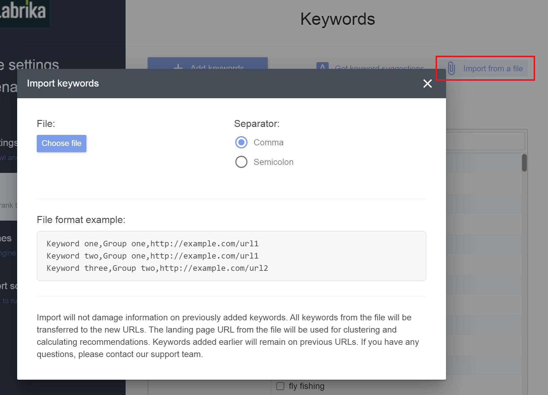 Você também pode importar um arquivo .CSV com três colunas e o Labrika importará automaticamente as palavras-chave, o grupo de ranking de palavras-chave desejado e a URL da landing page – isso é substancialmente mais rápido do que adicionar palavras-chave manualmente para verificação de ranking.