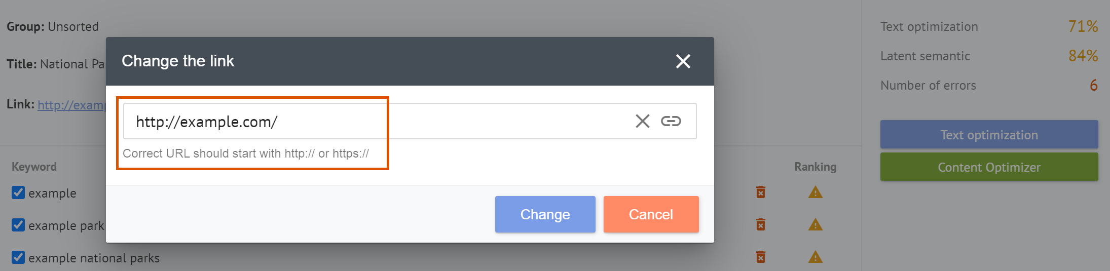 चौथे, एक नई स्क्रीन खुलेगी जहां आप कीवर्ड समूह का URL बदल सकते हैं। बस URL संपादित करें, और "चेंज" पर क्लिक करें। आपका चयनित कीवर्ड समूह अब इसके साथ एक नया पेज URL संबद्ध होगा: