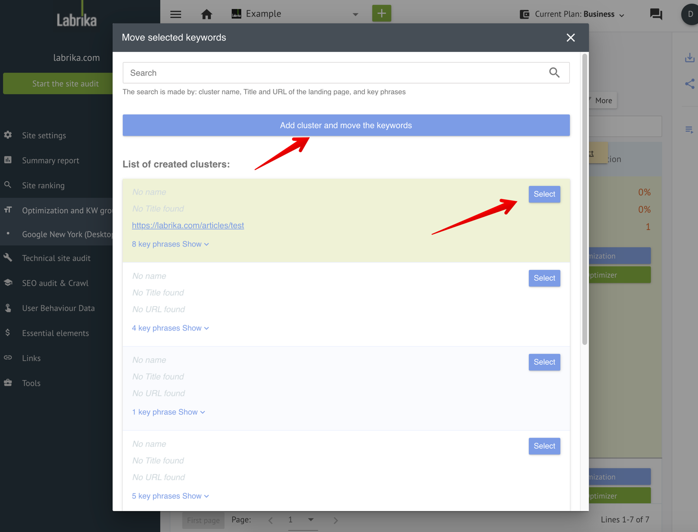 लैब्रिका स्वचालित रूप से कीवर्ड को आपकी साइट पर प्रासंगिक पेजों से जोड़ने की कोशिश करेगी। हमारे कई प्रतियोगियों के विपरीत, हमारा परिष्कृत AI-नेतृत्व वाला एल्गोरिथ्म रैंकिंग क्षमता और कीवर्ड/विषय प्रासंगिकता पर मुख्य रूप से आधारित निर्णय लेते समय कई कारकों को ध्यान में रखता है कि कौन से पेज किस कीवर्ड समूह को शामिल करेंगे।