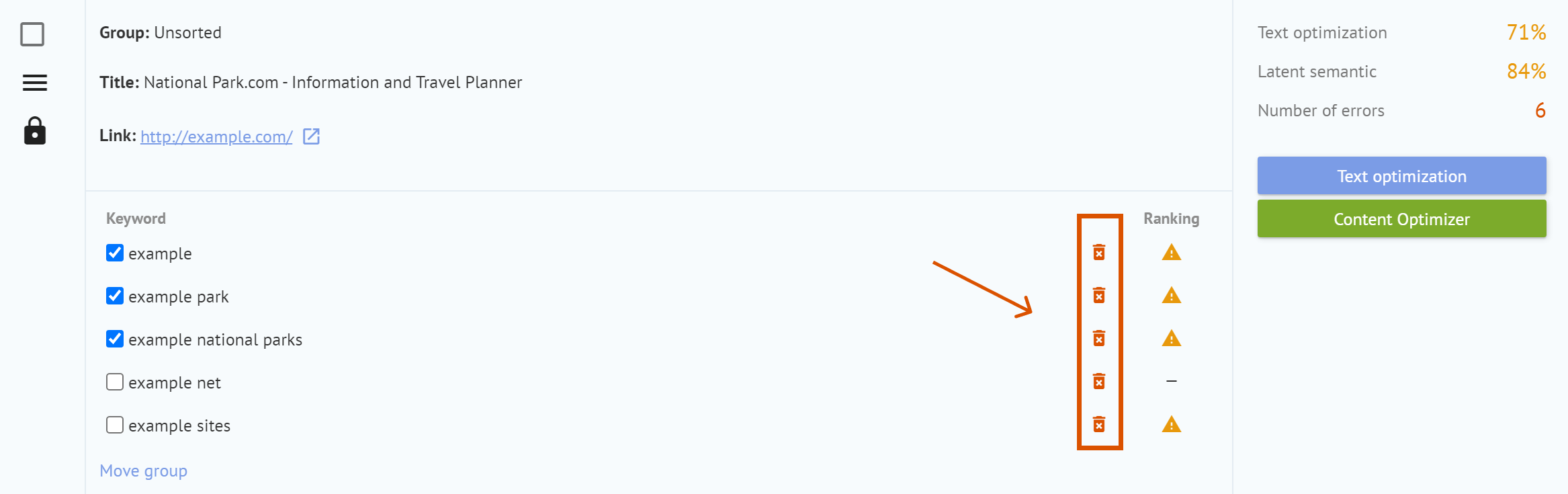 आप कीवर्ड समूह पेज से सीधे प्रोजेक्ट से कीवर्ड हटा भी सकते हैं बिना साइट सेटिंग्स में जाने के। कृपया ध्यान दें, किसी समूह से कोई भी कीवर्ड हटाना उस कीवर्ड की पूरी इतिहास भी हटा देगा (इसमें कीवर्ड सहित रिपोर्ट शामिल हैं):