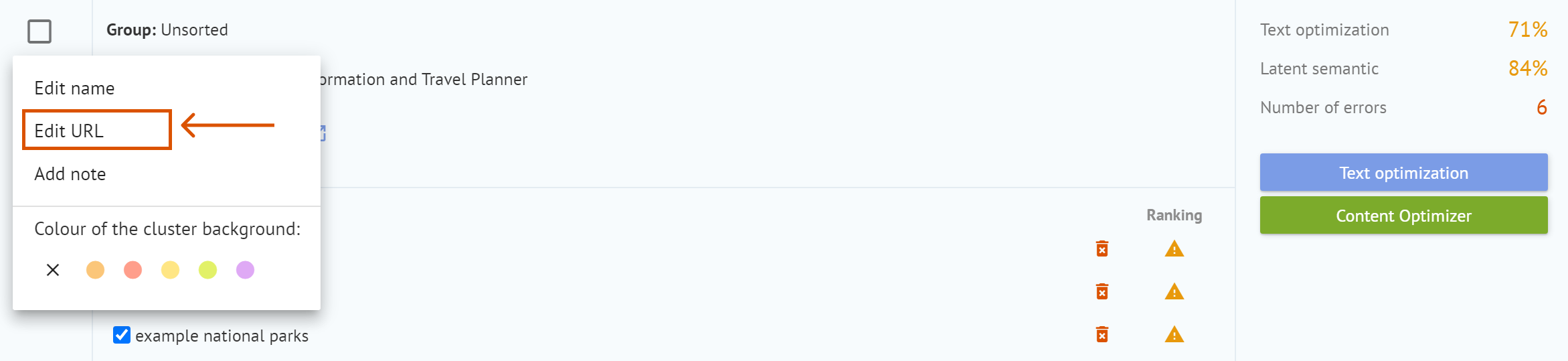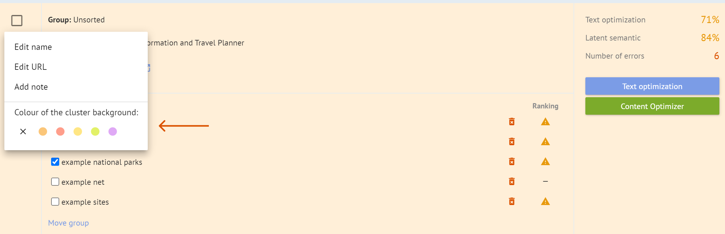 आप उस समूह के तीन लाइन आइकन पर क्लिक करके कीवर्ड समूह के लिए रंग सेट कर सकते हैं, नोट्स जोड़ सकते हैं, URL संपादित कर सकते हैं, और नाम संपादित कर सकते हैं: